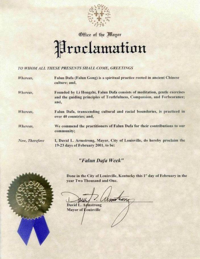 【明慧网2001年3月8日】 肯塔基州路易斯维尔市宣布2001年2月19-23日为“法轮大法周”
