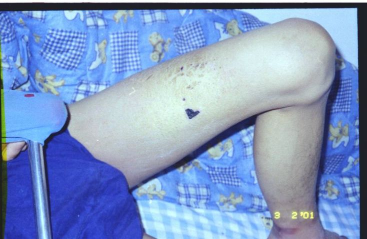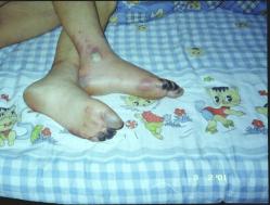 法轮功学员的手段之一是让学员脱了鞋袜、衣服在寒冷中挨冻。这是一名法轮功学员被冻坏的下肢。这位学员被释放多日后仍不能行走。