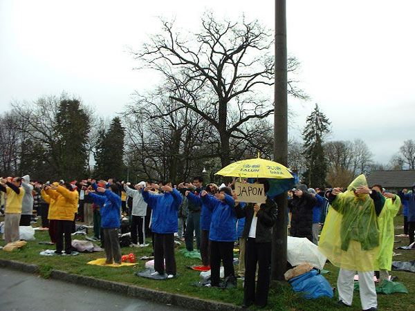 | 日本弟子雨中炼功壮观场面,牌子为日本(法语) | 公园炼功 |