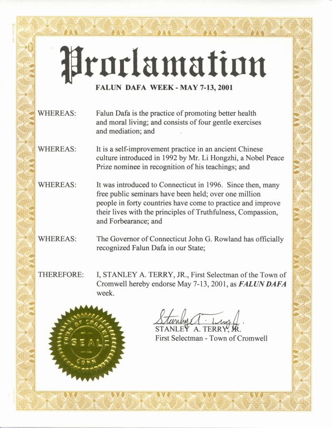 【明慧网2001年4月16日】 康涅狄格州克罗姆维尔镇宣布2001年5月7日-13日为“法轮大法周”