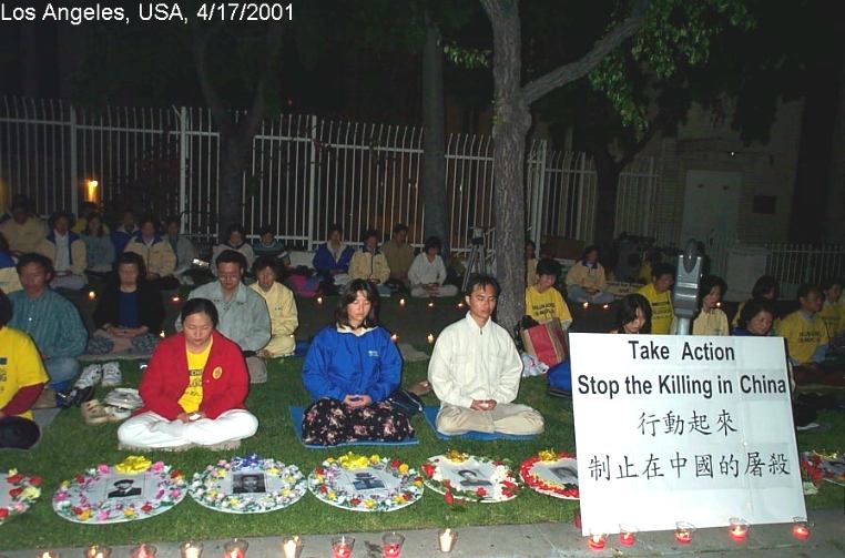 【明慧网2001年4月19日】 4月17日晚近百名洛杉矶法轮大法学员在中领馆前烛光悼念被江泽民犯罪集团迫害致死的大陆学员。