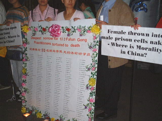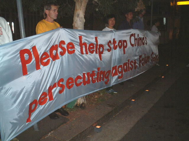【明慧网2001年4月20日】4月17日下午5时,悉尼地区170多名法轮功学员陆续来到中国驻悉尼领事馆前,在黄昏中点燃一支支蜡烛,悼念在中国为坚修大法而被江泽民帮凶迫害致死的190多位法轮功学员,同时也呼吁目前正在日内瓦召开的联合国人权大会谴责中国践踏人权的暴政,关注法轮功在中国惨遭迫害的严重状况。