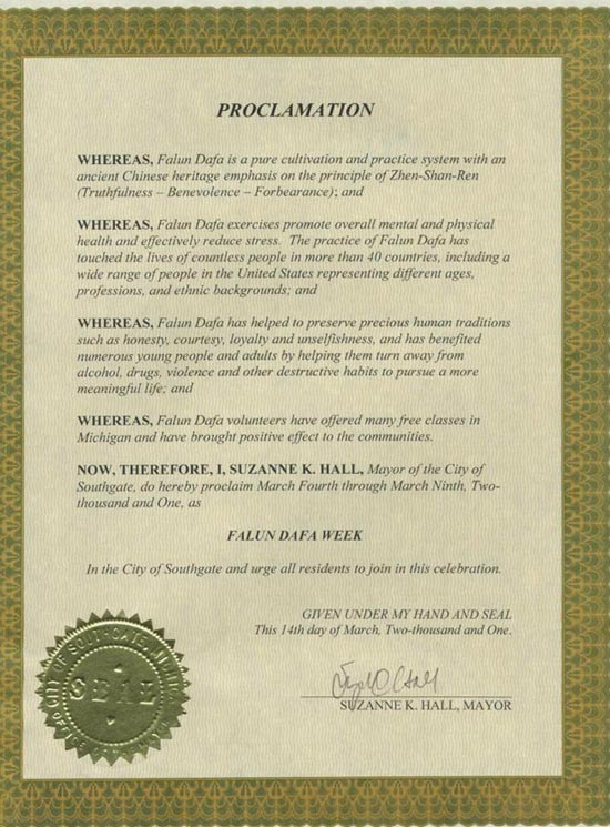 【明慧网2001年4月21日】密西根州南格特市宣布2001年3月4-9日为“法轮大法周”。