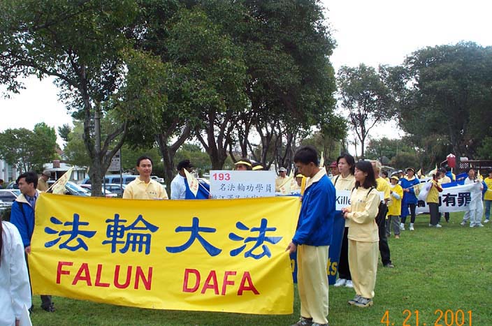 参加游行的学员中有八十多岁的老人,也有五、六岁的孩子,几位白人学员也加入到游行队伍里。由“法轮大法”的大横幅引导,伴着“普度”、“济世”悲壮的旋律,学员们缓缓地、静静地行走在大街上。队伍中的标语牌和横幅上写着:“法轮大法是正法”,“善有善报,恶有恶报”,“认清江泽民邪恶”,“镇压法轮功有罪”,“193名修炼者被折磨至死”……,无声地向世人诉说着大法受迫害的事实,呼唤着人间的正义良知。