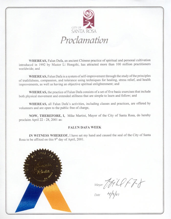 【明慧网2001年4月23日】 加州圣塔罗萨市(City of Santa Rosa, California)宣布2001年4月22日至28日为“法轮大法周”。