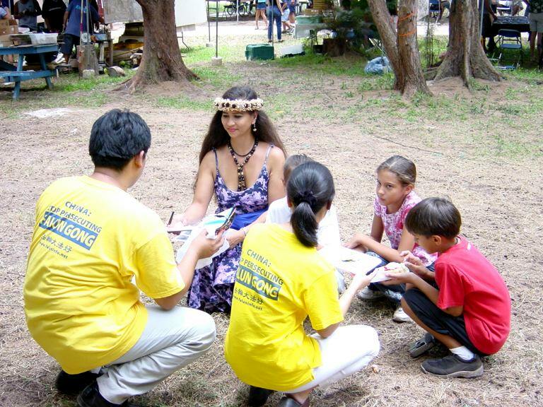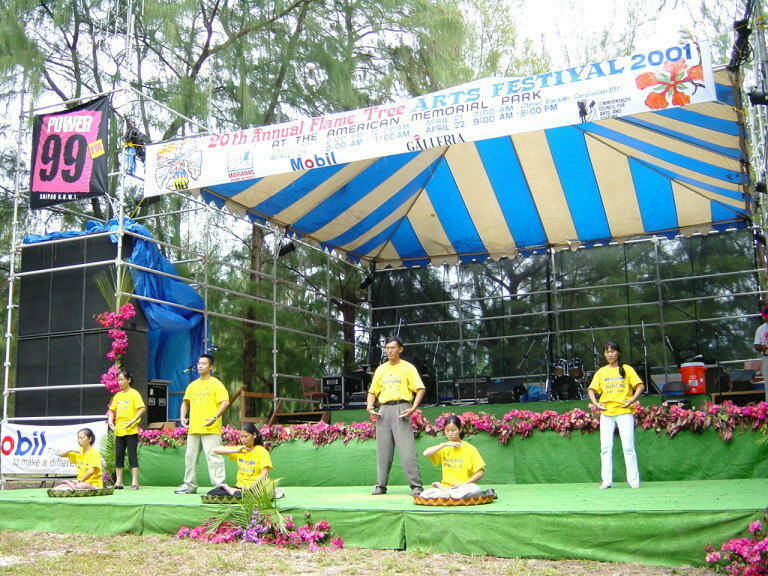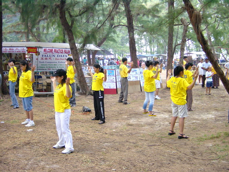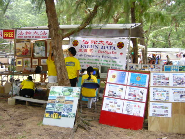 4月21、22日塞班岛弟子租了一个大展位,挂上大型的法轮大法宣传广告,金光闪闪的法轮格外抢眼。弟子们穿上黄T恤在草地上反复集体炼功,吸引了很多游人驻足观看,有些弟子在散发各种真象材料,同时向人们征集签名。表面上好像是我们求得世人的同情帮助,实际上是在正法过程中尽量地挽救未来的人,能救一个就一个。在两天时间共征集了一百多个签名,散发近千张传单。
