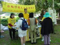 同一天在加州大学柏克莱分校校园内“国际留学生组织”举办了中国春节联谊活动。加大柏克莱分校的学员参加了联谊活动,向师生们介绍法轮功及在中国受到江泽民犯罪集团的迫害的情况。素有支持人权传统的柏克莱学生反映十分热烈。(图为柏克莱学员在向参加活动的游人介绍法轮功。)