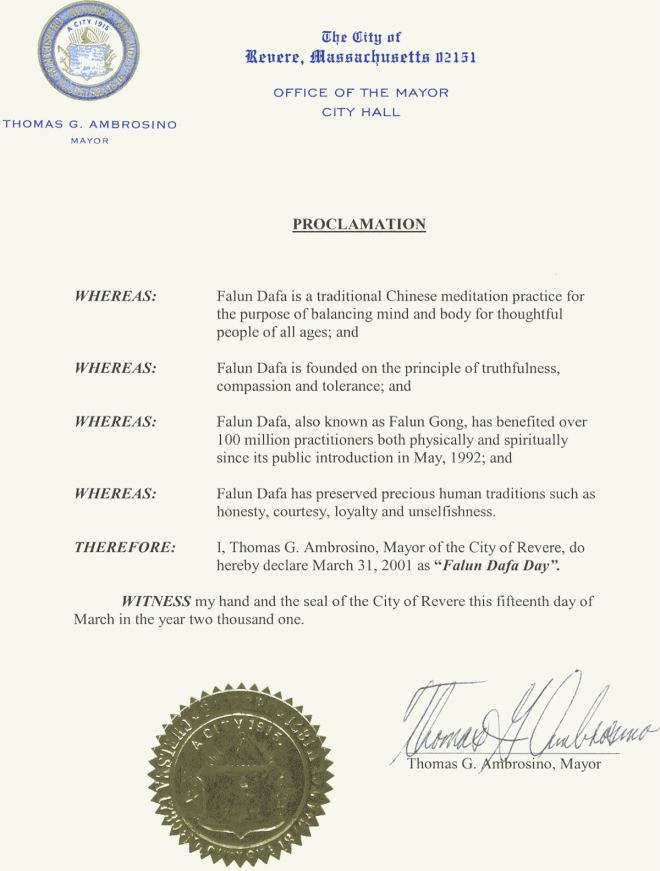 【明慧网2001年4月3日】 马萨诸塞州崇敬市宣布2001年3月31日为“法轮大法日”