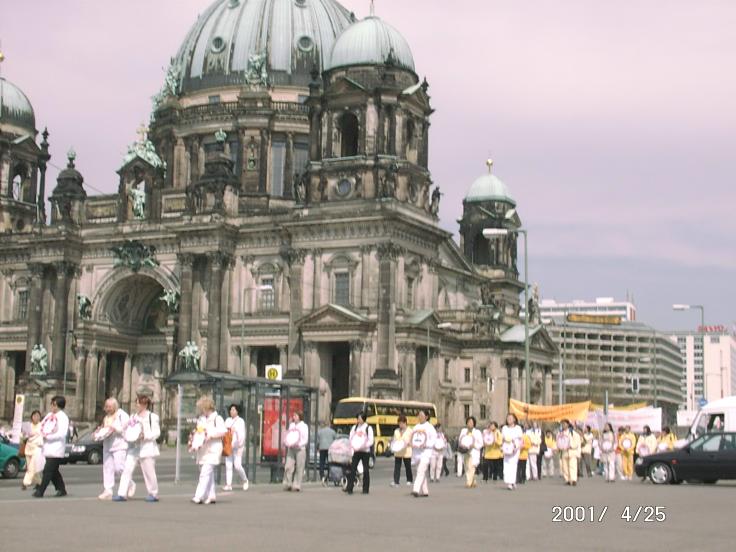 中午学员们在柏林进行了游行。这支队伍在喧闹的市区尤为引人注目。在游行队伍的最前段,两位西人学员庄严地抬着一块围着花环的纪念死难者的大幅图片。紧接着是小弟子们抬着花圈缓缓地走在队伍前排。在队伍中,学员们举着横幅和图片,在“普度”和“济世”的音乐声中,游行队伍缓缓地行进在柏林的中心大街上,气氛异常肃穆庄严。路人被这支宁静的队伍强烈吸引住了。两位从法国来的游客在路旁竖起大拇指对学员说:“法轮功好!”有的开车人专门停下车来向学员要资料。无数行人在街边驻足观看并十分乐意接受学员发的资料。有的主动走向学员来了解真象并表示他们理解和支持学员的行为。