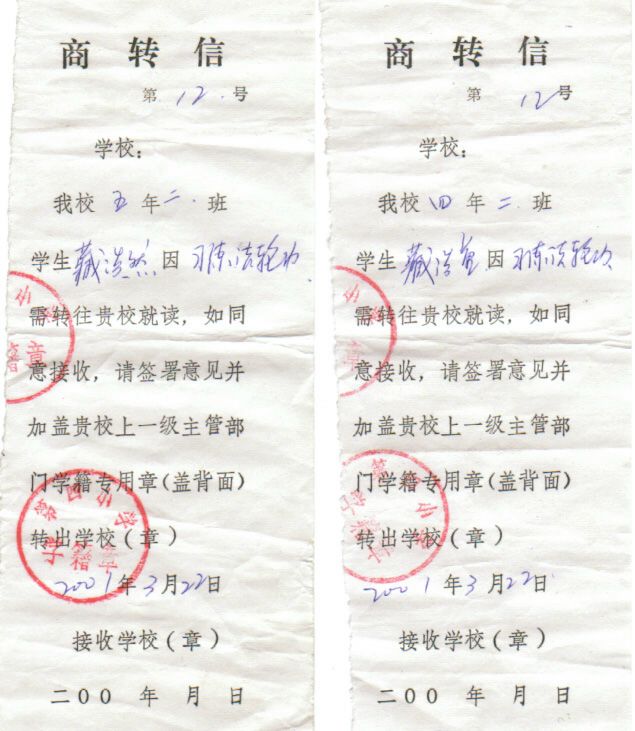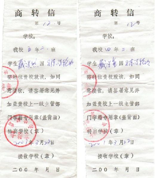 【明慧网2001年4月9日】 黑龙江省双城市大法弟子臧浩然,14岁,男,双城市第四小学校五年级二班的小学生。在2001年三月份双城市各中小学校组织学生以写作文形式“揭批”法轮功时,臧浩然写了一篇《法轮大法是正法》的作文证实大法的清白。但是校长和学校的老师威胁臧浩然说:"如果你不骂大法和你们老师、坚持炼法轮功,就开除你学籍!"在高压下,小浩然坚决不放弃法轮功并坚持炼功,校长为了保住自己的乌纱帽,又不敢公开以炼法轮功的名义非法开除臧浩然的学籍,便强行开商转信(实质就是开除),让臧浩然必须转学,如果不转学也不准上学,然后对学校的广大学生谎称臧浩然因为打架才让转学的,但是臧浩然在学校一贯表现很好,从来不打架也不骂人。