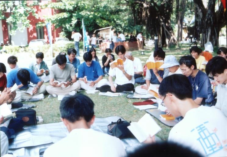 首先我们先是读了师父的精進要旨与新经文,再来即是各校大法成员的交流时间。每个大学都介绍了各自的社团近况与大法在学校的推广情况,并举很多具体事例说明如何洪法与讲清真相。例如中正大学于4月中即举办了「法轮大法周」:在活动期间,他们运用了一些不错的效果,如挂两条两三层楼高的两句洪吟诗句、图片展、书展、影片欣赏、放洪法录像带在人多的餐厅、功法展示、两场说明会等等方式使校内师生都能接触到大法,把整个校园的场都带动起来。而各自大学也都谈了如何运用当地环境与特殊性洪法,如直接成立社团、办说明会、申请在校内办九天班或利用教育学程的特殊性洪法、放大法书籍于图书馆或学校书局、发传单至学生各间宿舍、在学校建立炼功点、放简介于图书馆或架有免费取阅之处等方式。虽然在这些过程中,难免会遇到挫折与困难,但每件事都存在着我们需要自己向内找的部分。有经验的学员于交流会中大致都谈到了于整个学校洪法中最重要的是全力以赴但是「人心」不能太重。