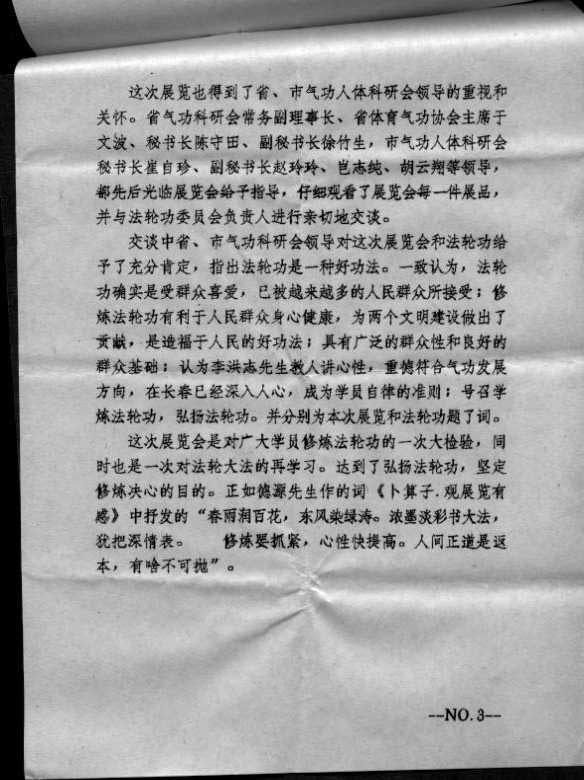 交谈中省、市气功科研会领导对这次展览会和法轮功给予了充分肯定,指出法轮功是一种好功法。一致认为,法轮功确实是受群众喜爱,已被越来越多的人们群众所接受;修炼法轮功有利于人们群众身心健康,为两个文明建设做出了贡献,是造福于人民的好功法;具有广泛的群众性和良好的群众基础;认为李洪志先生教人讲心性,重德符合气功发展方向,在长春已经深入人心,成为学员自律的准则;号召学炼法轮功,弘扬法轮功。并分别为本次展览和法轮功题了词。