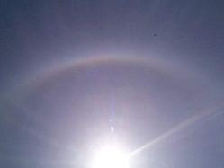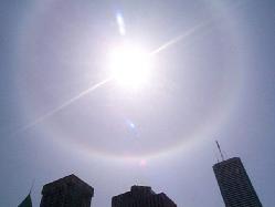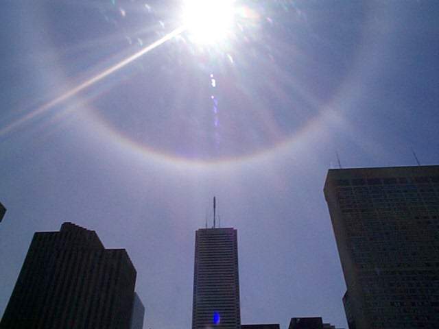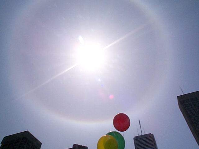 多伦多大法弟子一大早和其他各族裔人士从四面八方汇聚到多伦多市政广场,这里将举行盛大的庆典,广场上到处是欢庆的人群。9点半左右,有学员看到天空中太阳的周围环绕着淡淡的光环,随着时间的推移,光环变换着色彩,而且是越来越大越来越清晰。天目开了的学员看到的是赤橙黄绿青兰紫的色彩在变换着,巨大的法轮展现在天空中,周围是许许多多的小法轮,更多更多的法轮在向天际漂动,学员身上到处是法轮,场面十分壮观。此时在场的所有人用肉眼都能看到这殊胜的场面。当时在场的西方媒体Cfmt和CTV的记者拍摄了这个场面,并赞叹到“这真是一个奇迹”。一些老人表示,从来未见到过这样的场面。随着太阳的升起,环绕在太阳周围的大法轮也在移动着,缓缓上升,整个场面持续了5个小时。