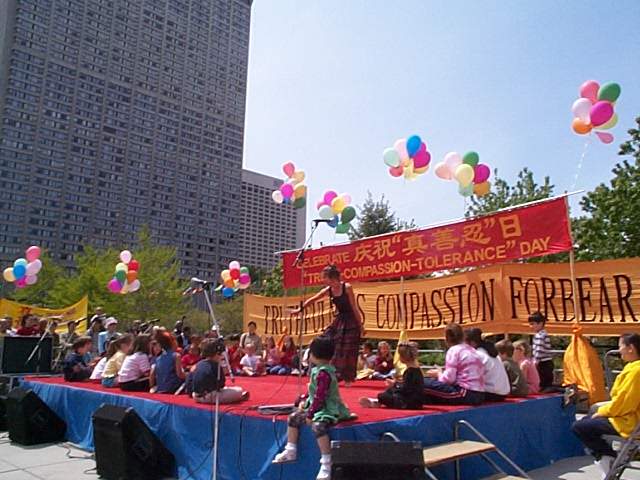 学员们邀请了许多不同族裔的团体、机构来到广场共设展点同庆,十几个展点向人们展示了不同民族风格的人文和风土,吸引了许多游人的目光,一场由各专业演出团体表演的精彩纷呈的音乐歌舞,使欢快的气氛从早上11点一直贯穿到下午四点庆典的结束。时逢母亲节,许多的父母带着他们的孩子加入到了这欢乐的海洋之中。为了让孩子们尽情地享受快乐,学员们精心为他们准备了许多有趣的活动。画脸桌前,一个又一个表情满意的孩子欢笑着离开;蹦蹦床上,孩子们旺盛的精力得以充份的展现;长长的画纸上,数不清的孩子留下了他们稚气但却纯朴的作品。而在整个广场上忙前忙后为大家服务的,则是一个个衣着端庄喜庆,面带微笑的法轮功修炼人。主席台上不断穿插的,是到场的政府要员对真、善、忍日高度赞赏和祝贺的讲话,以及学员对法轮大法及真、善、忍的简短介绍。