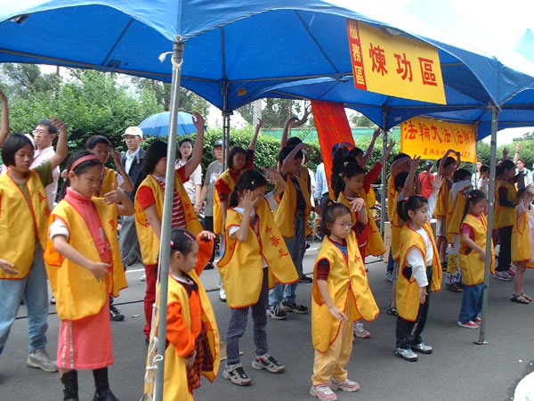 初夏早晨,风轻草绿,悠扬的大法音乐缭绕耳畔,和煦的阳光伴随着丝丝细雨,微微的风让川流不息的游客显得清爽快意。突然,你发现某个地方围绕着许多游客在那流连徘徊着;仔细一看,原来是一群纯净真挚的小弟子们正演示着五套功法:他们端凝认真的表情,不时露出盈盈笑意。孩子们天真稚气的脸庞,让一旁观赏的游客也感染了他们那颗纯净、不受污染的心灵;看着孩子可爱的笑容,游客的嘴角也自然地往上扬起。