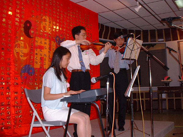 说明会场的节目,由三位大法弟子为世界法轮大法日所献上的「普度」小提琴三重奏拉开了序幕;其悲壮感人的乐声,让听者深深动容。再来是由三十多位大法弟子所组成的「真、善、忍合唱团」的演唱,演唱歌曲包括「母亲您真伟大」、「游子吟」等,不管是指挥还是伴奏,无论是二重唱还是四重唱,其超水准的演出令人惊叹,合唱完毕更频频让人高喊「安可」。