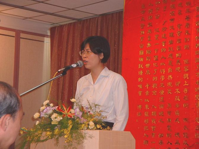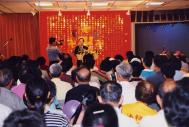 除了室外的活动,走进室内的说明会场,最前面的礼台挂着由闪闪发亮的金字所排成的《论语》;墙壁上贴着师父的《游日月潭》,旁边则装饰着朵朵康乃馨,象征母亲佳节的温情。说明会场内的所有布置都让人觉得庄严神圣,许多游客一进来便自动脱帽弯腰,然后安静地找位置入座。场内所摆放的一百多张椅子,从开始到结束,一直座无虚席,后面与两旁更站着许许多多不想离去的游客。