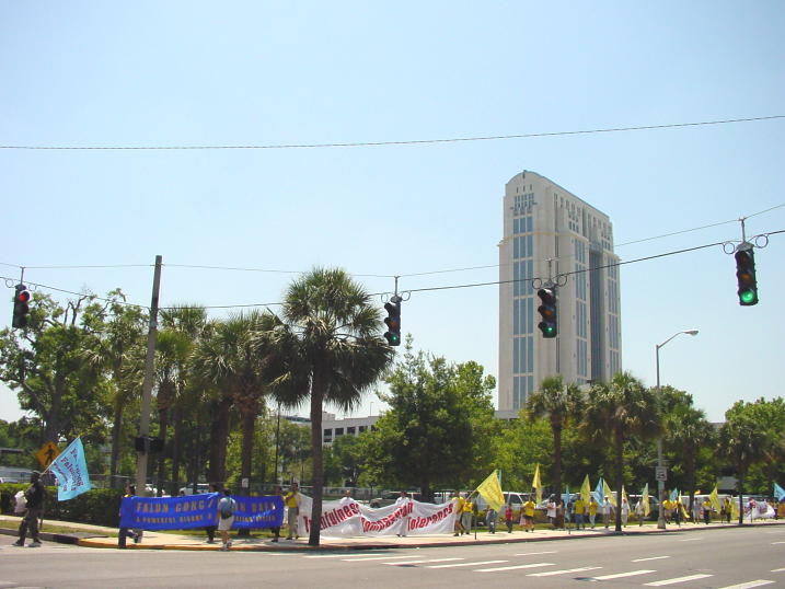 下午东西方学员一起学法,重点讨论了怎样"站在法中认识法"和"以法为师"。同时我们还进行了一天的法轮功图片展览。八十多幅彩色照片向人们展示了法轮功的真实情况。图片的十个部分记述了法轮功在中国,美国,世界各地,佛州,奥兰多周边城市的洪传,法轮功学员的和平请愿等,图片还反映了法轮功在佛州各大学,和少年儿童中的弘法活动,以及佛州法会的情况。板报介绍中揭示了大量中国弟子被迫害的情况。