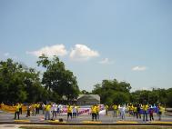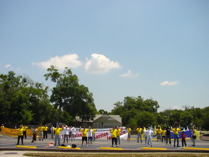 功法表演后,进行了近两个小时的沿街游行。所过之处吸引了很多过往的车辆,他们鸣笛向学员们祝贺。有的司机停下来询问,并拿走了资料和传单。游行之中我们停下来再次向行人作洪法表演。报社的记者也跟着我们游行并拍摄照片。