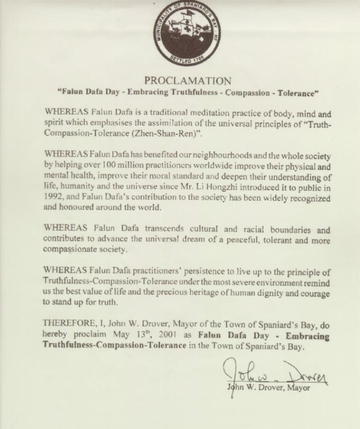 【明慧网2001年5月17日】加拿大纽芬兰省斯伯尼亚德湾镇宣布2001年5月13日为“法轮大法真善忍日”。