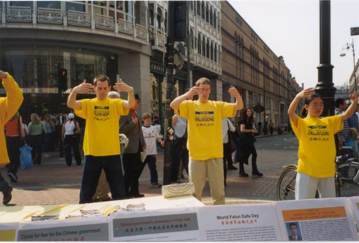 【明慧网2001年5月17日】庆祝“世界法轮大法日”暨李洪志师父传法九周年,爱尔兰学员于5月12日在都柏林最繁华的商业步行街(Grafton)集体炼功、洪法。多雨季节的爱尔兰,这一周来天气却出奇地晴朗,因此过往行人特别多。我们身着黄色炼功服,并在介绍大法真相的展板上装饰了印有“法轮大法”字样的色彩缤纷的气球,颇具节日的气氛。舒美的炼功动作、优雅的炼功音乐和鲜艳的色彩吸引过往的行人驻足观看,并索要简介材料。我们不到一天内竟发出一千多份简介,创历史最高记录。许多小孩索要气球,等我们炼完功时,气球也都送完了。我们悟到,多做一些印有大法字样及网址的气球也是一个很好的洪法方式。