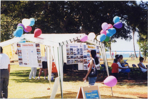 这一天早晨,风和日丽,清爽的海风习习吹来,沁人心脾,十分怡人。我们来到了绿色葱葱,水天一色,美丽迷人的阿拉摩那公园的奇异岛上。只见五彩缤纷的气球迎风飘扬,法轮大法的横幅格外耀眼夺目。一个以白绿相间条纹网布搭起的帐篷四周摆放着大法的图片展览。旁边是一棵枝叶繁茂,高高耸立的榕树。树下摆放着两张桌子和十几把椅子。一张桌子上摆放着电视机和大法书籍,另一张为音响设备。