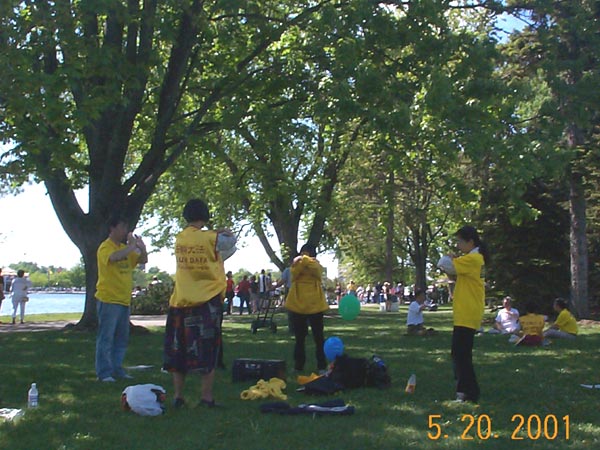 我们还遇到了一个感人的故事,一个来自台湾的修炼家庭,他家的两个儿子和大儿子的女朋友今天都是第一次炼功,他们竟然能够双盘近一个小时。他家的大儿子告诉我们,他受父母的影响,于98年到多伦多参加法会,第一次见到师父。之后他虽然没有炼动作,却常常看书。这次法会,他再次见到师父,并听到师父讲法,内心受到深深的震撼,决定做个真正修炼的人,就开始学习五套功法。