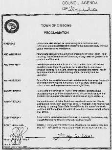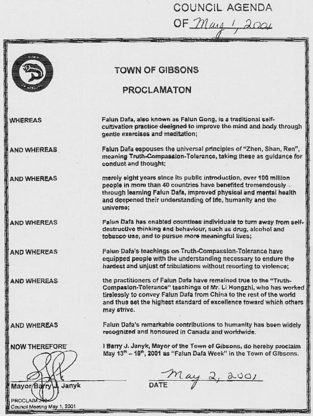 【明慧网2001年5月23日】加拿大不列颠哥伦比亚省吉布森镇宣布2001年5月13-19日为“法轮大法周”。