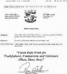 【明慧网2001年5月23日】加拿大不列颠哥伦比亚省科特尼市宣布2001年5月13-19日为“法轮大法真善忍周”。