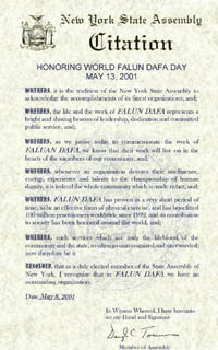 坚定地,作为一名正式选举的纽约州众议员的一员, 我赞誉在法轮大法中我们拥有一个杰出的群体。