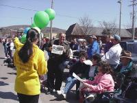 四月二十九日星期日,来自加拿大蒙特利尔地区的三十来位学员,以及来自波士顿地区的二十来位学员不约而同的早早就来到集合地点。蒙特利尔的学员带来几百个写有“法轮大法”及“真善忍”的气球以及一些顶在车蓬上的标牌,波士顿学员则带来了许多大法横幅及报纸。大家有条不紊,忙而不乱的做着各种准备活动:贴介绍会的标签,充气球,摆横幅,装饰汽车,摆放音响…没有什么客套,也没有任何勉强,只是从学员们满面春风的笑脸,从那洋溢着的发自内心的喜悦,就能深深感到学员们那种和平宁静,那种坚定成熟之美。预定游行的时间推迟了一个多小时,大家毫无怨言。负责组织游行的帕特女士很惊奇我们有这么多的人,来自各个不同的地区,而且配合得这么好。她夸我们的队伍是最长最好的。她对学员说:“你知道往年的枫树节总要下雨,今天天气怎么这么好。”我们学员回答道:“因为今年我们来了。”她笑眯眯的似懂非懂。