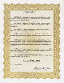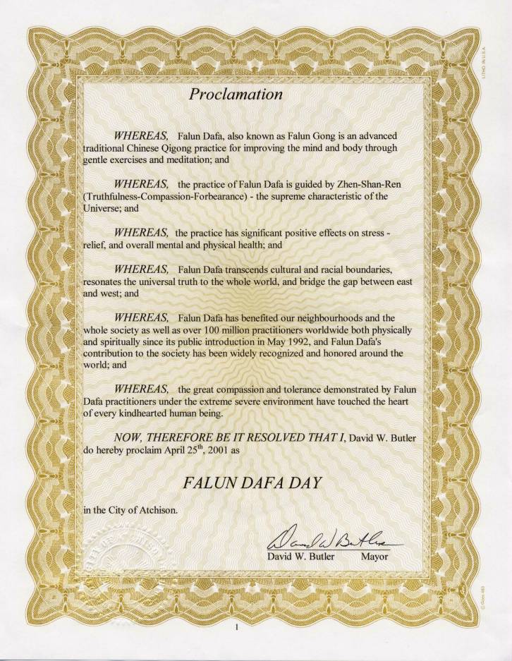 【明慧网2001年5月3日】堪萨斯州阿奇森市宣布2001年4月25日为“法轮大法日”