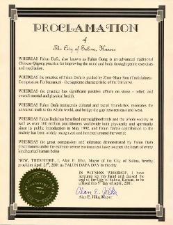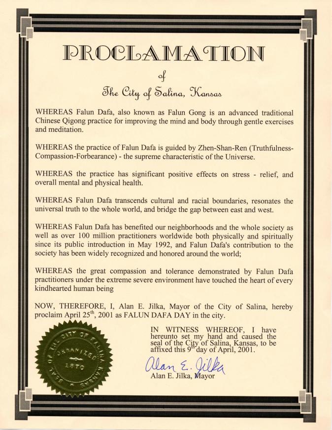 【明慧网2001年5月4日】堪萨斯州萨林娜市宣布2001年4月25日为“法轮大法日”