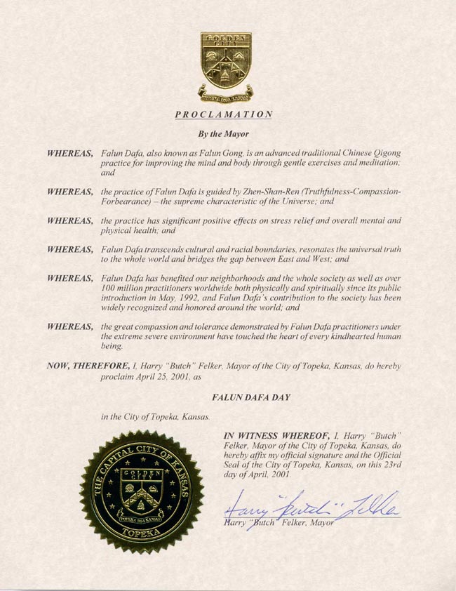 堪萨斯州托匹卡市宣布“法轮大法日”