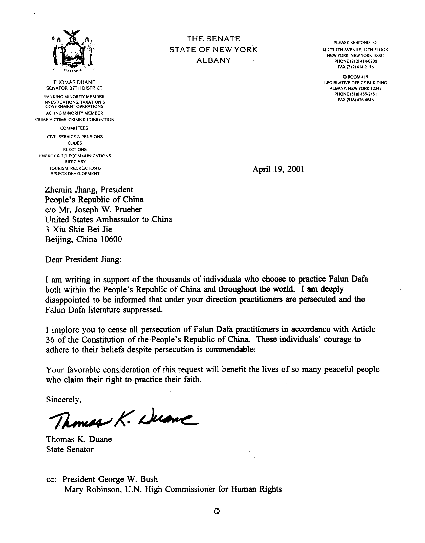 我写此信来支持在中华人民共和国和遍布全世界数以千计的选择修炼法轮大法的个体。得知在你的指示下(法轮功)学员们遭受迫害、法轮大法书籍被禁,我感到深深地失望。