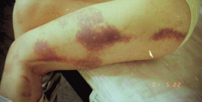 最后我被打倒在地难以爬起,门牙被打掉了两颗,头部多处被击伤,浑身肿胀发紫,骨头像散了架一样,但这个恶警竟然兽性大发,又朝我右耳及太阳穴处猛击一棍,将我打昏,在我昏迷的时候,这个禽兽不如的恶徒竟然将我拖到桥下,撕开我的裤子,将我强奸。而后更全无人性地把胶皮棍猛劲插入我的阴道里,他却骑到我身上。等我缓过点劲,能喊出声的时候,我竭力地呼喊:“救人哪!抓流氓!”这个恶徒却仍有恃无恐。直到我声明要去派出所告他,他才慌了,丢下我骑车逃跑了。