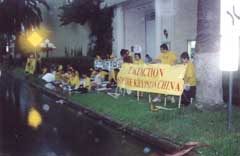 【明慧网2001年6月2日】这两张照片是5月26日我们在中国驻休斯顿总领馆门口参加全世界大法弟子“发正念”活动时一个过路的美国小伙子照的。当时是第二次发正念以后,狂风大作暴雨倾盆,负责照相的学员赶去扶横幅。这个小伙子正好路过,抓拍了几个镜头,然后他赶回家取来了摄像机录了一段现场。第二天,他特意将冲洗出来的照片送到领馆门口我们炼功请愿的地方。