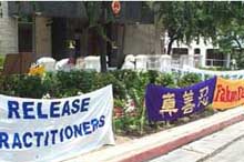 请愿过程中,中领馆一个屡次无理取闹的工作人员跑出来,指着挂在领馆门前的横幅说:“把这些东西拿走!你们不拿,我们就给你们扔了!”说着就撕下两条横幅扔在车来人往的马路上。学员坚持把横幅放回原地,并叫来了警察。几位警察来到现场,弄不清挂横幅的地方是属于哪方领土,乾脆把管理房产的经理请来。经理明确表示,这里是美国领土,可以挂横幅。但领馆人员还不甘心,要求挂远一点,学员说:“就是给你们看的,远了你们能看清吗?”“对,这样很好!”那位美国经理说。一位看上去是领头的警察临走时还要了一些大法资料。