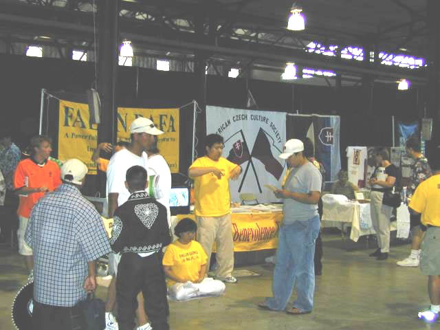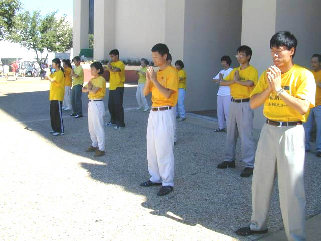 16日一大早,达拉斯的学员和长途驱车而来的休士顿、奥斯汀及圣安东尼奥的学员们就来到了位于达拉斯市中心附近的集市公园(Fair Park)内的巨大的国际节展厅。进了展厅才惊喜的发现我们的展位给安排在了一个很现眼的位置。很快的布置好展位之后,大家就自发的一部份留在展位前向过往的人们介绍功法和散发介绍真相的资料,其余的学员便到外面集体炼功和为功法表演作准备。