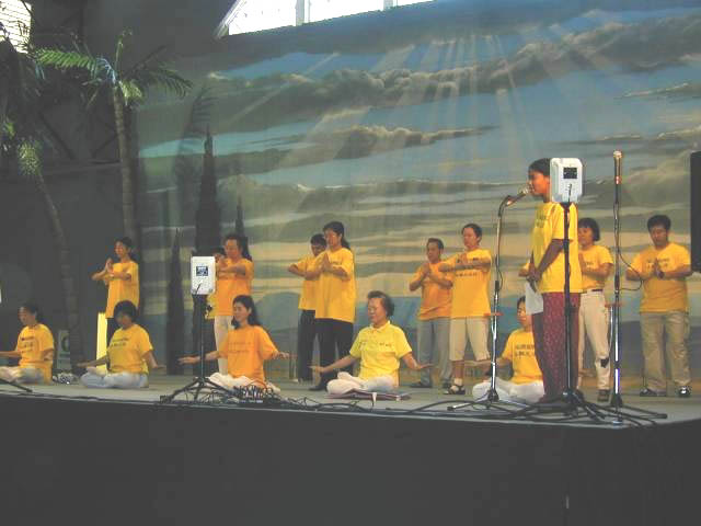 到了表演的时候了。午台上,伴随着悠扬的大法音乐,十几名大法弟子开始演示五套优美、舒展的功法,同时一位西方学员在前面做功法和有关大法真相的介绍。我们的背景画面是一道道金色的阳光穿破乌云照耀着大地。如此的场景与舞台上身着明黄T恤的大法弟子完美的融合成一体,给人们展示了一副法正天地的壮丽画面。人们认真的看着,忘记了周围嘈杂的喧闹声,仿佛置身于另一境地,台上台下一片祥和,令人感动。