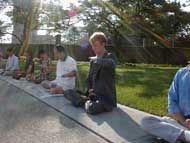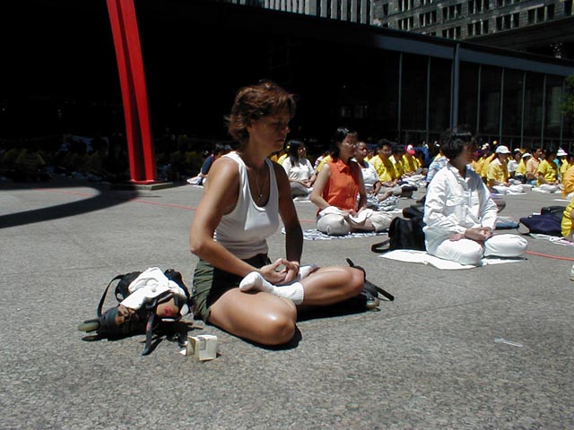 有几位华人看到这么多学员在炼功(因为我们图片展平时都是地区性的,人数不多)就问我们,有没有名册,给不给钱。学员告诉他们,法轮功讲真善忍,教人向善做好人。我们是法轮功的受益者,都是自愿自费来的,没有组织。我们只是表达我们的心声。让人们知道法轮功是好的,江泽民集团对法轮功的迫害是不对的。