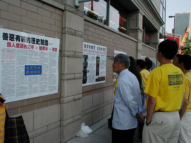 一位老华侨对法轮功学员的行为不太理解,在看了图片展,及听了一位学员给他讲述了她在中国的遭遇及她周围的法轮功学员的被迫害的情况后,他表示了对法轮功的同情,并开始跟学员学炼动作。