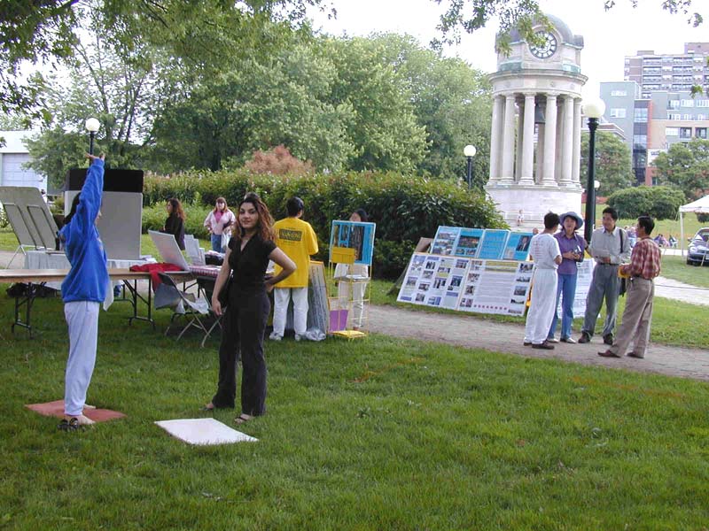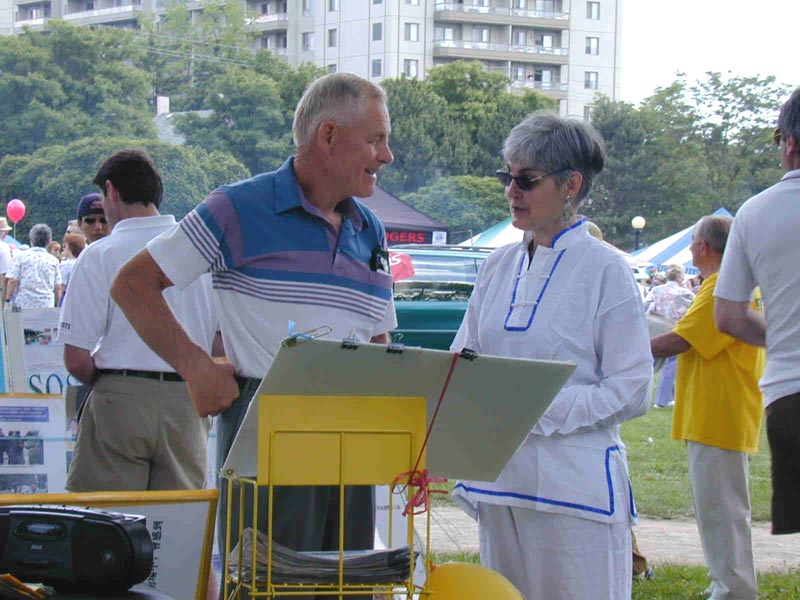 西人的普遍问题是“这么和平的练习为什么要镇压?法轮功和法轮大法的区别?法轮功和其他方法的区别,比如太极、瑜伽?”学员们都一一耐心的解答,西人都很愿意签名。有时要排队等着签名。有位小儿麻痹西人女孩从轮椅站起来签了字。另一位妇女问还能怎样帮助。我们给了他加总理的地址。她说她会给总理写信。有位妇女问什么是地牢,政府怎么可以这样对待公民?有位老人走后,过了一会又回来,告诉我们英文报纸上有个错字,希望我们下次纠正。