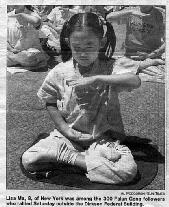 照片:300名法轮功成员中的丽莎.马,8岁,来自纽约,在市政联邦大楼前