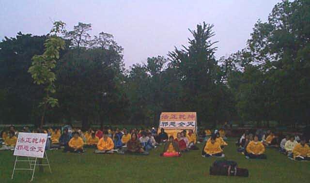 六月三日下午三点四十左右,泰国大法弟子来到皇后公园炼功点,在打坐清除自身不好的因素之后,四点正开始〈北京时间17点〉与全球大法弟子一起集体发正念。当我们单手立掌,发出“法正乾坤,邪恶全灭”的真念时,四周一片肃穆庄严。在五点、六点的再次发正念之后,大家看到一直笼罩着我们上空的阴云已经消散,天空复又晴朗,夕阳生辉,天清体透。