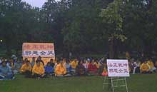 | 70多名学员在尖沙咀海滨公园齐心合力清除邪恶 | 学员在尖沙咀海滨公园发正念 | 三十多位学员在中联办外发正念 |