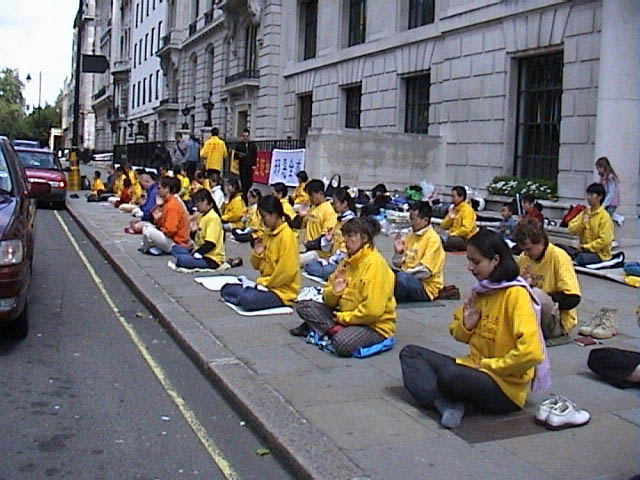 来自大伦敦地区和伦敦附近城市的大法弟子约五十人,在中国大使馆门前,集体炼五套功法。来往车辆上的人们,都被这壮观的场面吸引了,几乎人人都接过了大法弟子递上的大法资料,有的旅行大巴士驶过,车上的导游还接过一叠大法资料,发给车上来伦敦的国际游人。