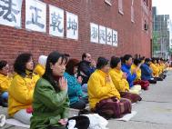 江泽民流氓集团丧尽天良地迫害法轮大法已近两年,不断有大法学员被抓,被打,被迫害致死,包括一些海外回国的大法学员。国内的学员上访无门,伸冤无处。我们国外的学员理所应当地去中国使馆请愿,强烈要求中国政府制止被大赦国际评为“人权流氓”的江泽民的犯罪行为,立即释放所有被抓的大法学员,还李洪志师父清白!芝加哥大法弟子现在几乎天天去中共领馆和平请愿,极大地抑制了邪恶势力的嚣张,同时使更多的世人有机会了解了真相!周六下午,几十位大法弟子如往常一样赶赴领馆炼功请愿,一部分学员从图片展直接去领馆,也顾不上吃中午饭。不管刮风下雨,请愿活动雷打不动。大家的心很定:只要不停止迫害,就不停止在中共使馆前的和平请愿!