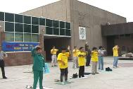 11:30当我们炼动功时,天空下起了雨点,动功结束时雨越下越密,这时正有电视台对我们采访,我们学员毫不犹豫开始打坐。等我们静功炼完后雨停了,紧接着我们开始发正念,发完正念后,天空放晴。使每一位学员感到了大法的威力。一位西人学员事后说:当他开始清除自己不好的思想时,他感到自己在一秒钟之内一下就静下来,在做立掌时,他感到从头两侧和头顶发出东西。他认识到时间的紧迫和师父的慈悲。