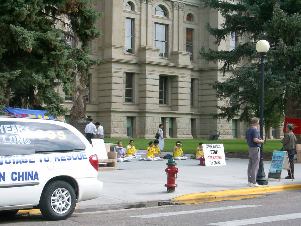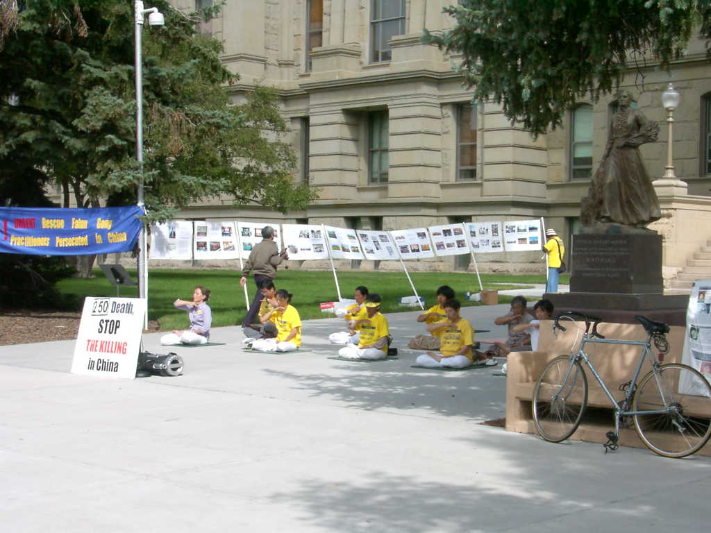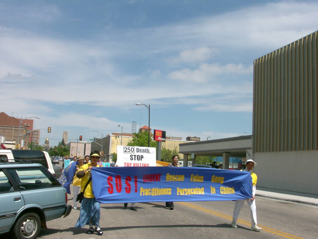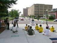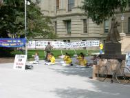 在游行的终点,我们重新布置了展示版及横幅,并开始了炼功活动。部分学员去发资料,就在我们炼功的时候,有一家四口人路过,他们很有兴趣的观看我们的炼功。当两位学员把资料递给他们时,他们开始向我们了解中国到底发生了什么?当学员讲述了江泽民政府所做的一切时,他们非常气愤,当我们问他们是否愿意签名时,他们一致地说:“当然,我们绝对的支持你们”,随后一家人都签了名。他们非常不理解这样祥和的功法在中国却不允许存在,并希望能进一步了解法轮功。因此学员送给了他们一套说明真相的录像带和炼功带。当他们要付钱时,学员说:“我们希望这么好的功法能和美国人民一同分享,所以这些都是免费的”,他们表示了非常的感谢,并在离开前热烈的拥抱学员说:“祝你们好运,一路小心”。这使我们深深地感到了美国人民的善良。